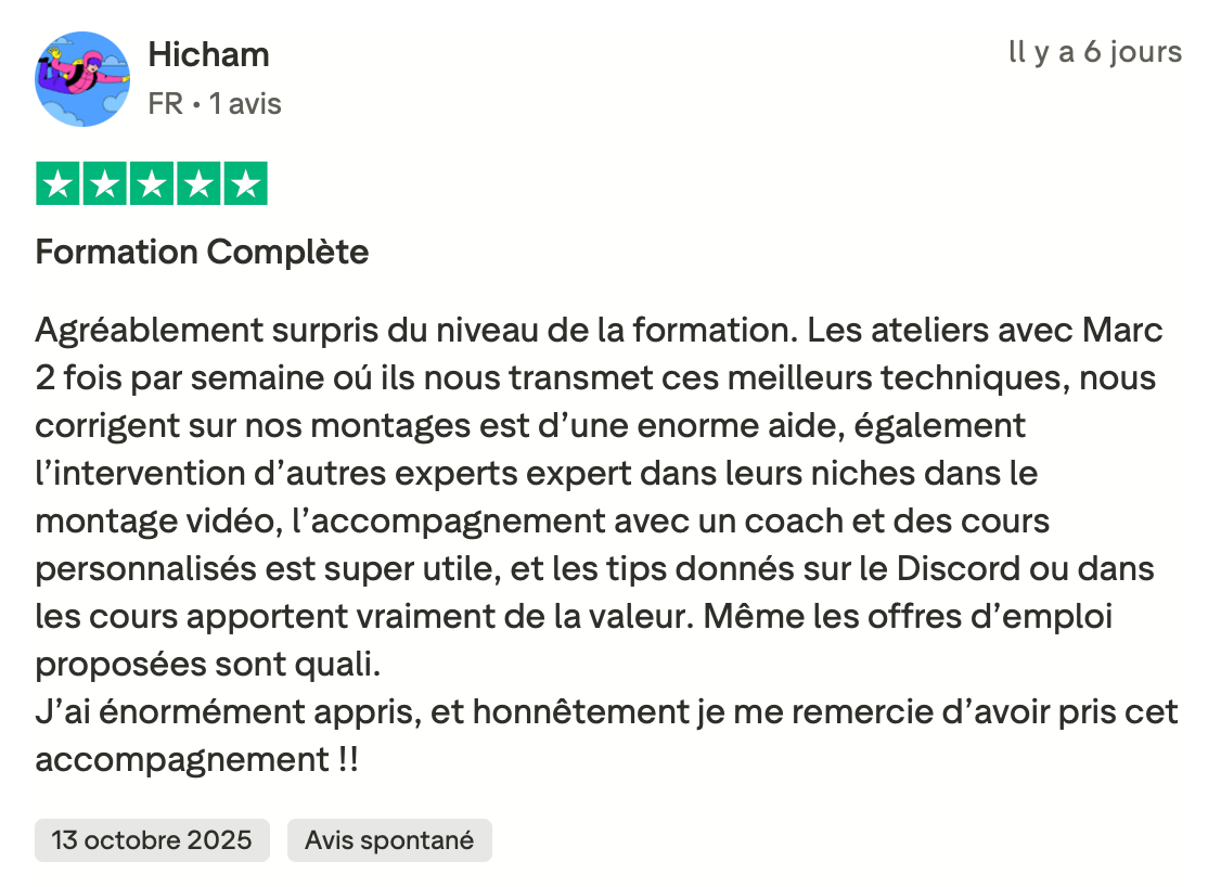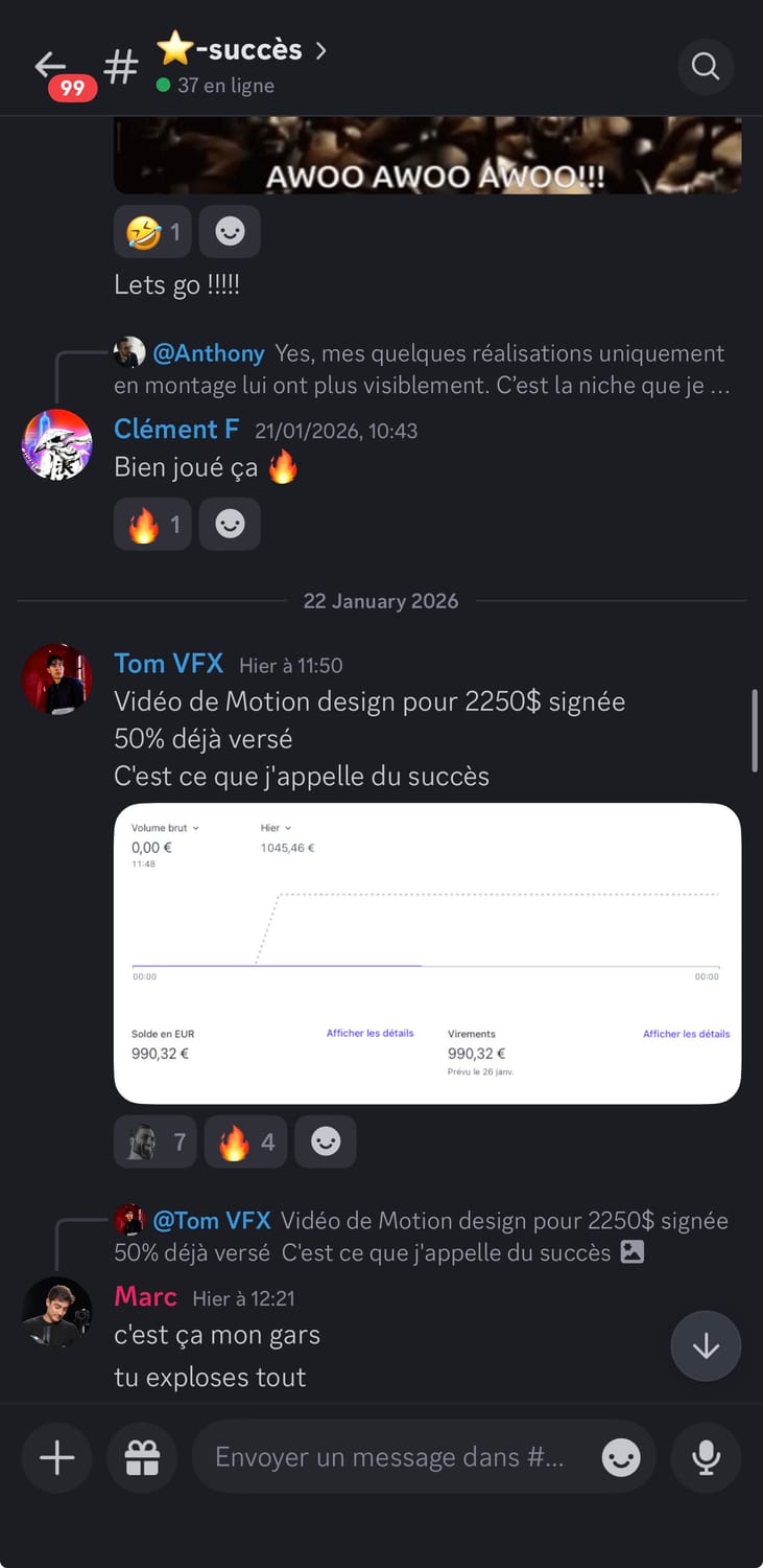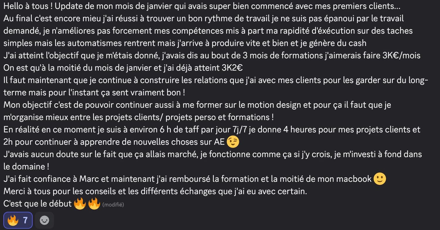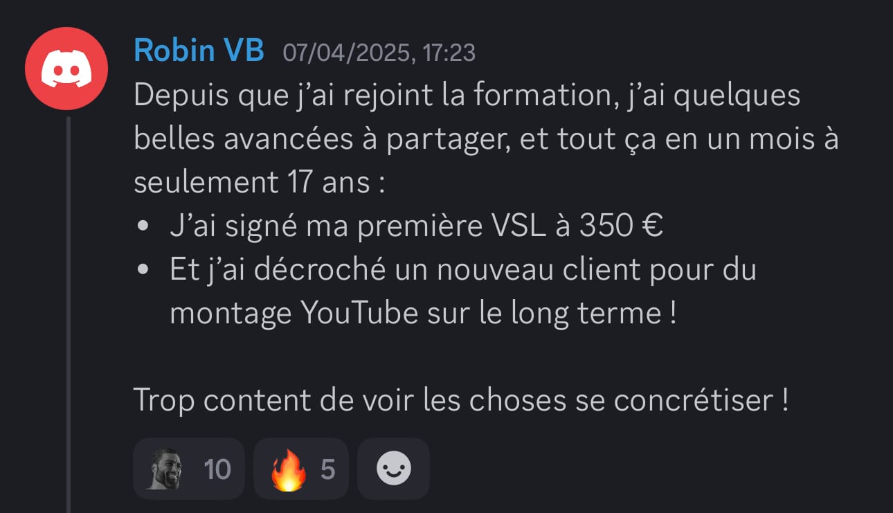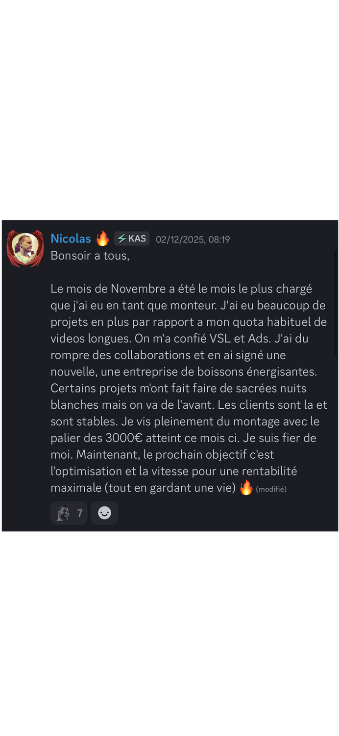 Si tu fais du montage vidéo et que tu as déjà eu quelques clients, mais que tu n'arrives pas à en vivre confortablement, cette vidéo est pour toi. Dans les prochaines minutes, je vais te montrer comment passer de monteur remplaçable, celui qu'on paye au lance-pierre et qu'on peut virer du jour au lendemain à un bras droit créatif qu'on valorise, qu'on garde, qu'on paye minimum trois mille euros par mois. Et ça, même si tu n'as pas encore un de dingue, tu n'as pas le temps pour te former, tu détestes prospecter et négocier. Mais d'abord, qui suis-je pour t'apprendre tout ça Je m'appelle Marc, j'ai vingt et un ans et en avril deux mille vingt trois, j'ai eu mon premier client en montage vidéo à cinq cents euros. Deux mois plus tard, je bossais avec Dali Dutiol, un gros créateur de contenu français et je facturais deux mille deux cents euros le mois. En moins d'un an, j'ai travaillé avec des gros de contenus comme Deli Dutiol, Grégoire Dossier et d'autres. J'ai réussi des tests de montage vidéo pour devenir monteur chez Iman Gadji. J'ai été invité à Cannes pour filmer une vidéo chez Yomi Dancel et j'ai même organisé un tournage qui n'a jamais été fait en France avec des grosses têtes que tu vois à l'écran. Tout ça parce que j'ai compris très tôt ce qui différencie un monteur qu'on remplace d'un monteur qu'on garde. Aujourd'hui, je me consacre à transmettre ce que j'ai appris. Ma mission, t'aider à devenir un crack du montage et atteindre minimum trois mille euros par mois. Mais avant d'aller trop loin, laisse-moi te montrer à quoi ressemble la vie d'un bras droit créatif. Imagine un instant, ton niveau technique est au-dessus de quatre vingt quinze pour cent des monteurs du marché. Tu maîtrises des techniques que très peu connaissent en France. Tu as développé ta propre vision créative, un style, une pâte, quelque chose qui te rend unique. Et surtout, tu n'es pas juste un menteur, tu es un pilier dans le business de tes clients. Tu comprends leur business, leur vision, tu proposes des idées, tu les surprends, tu es un bras droit créatif. Résultat, tu n'as plus besoin de prospecter. Les créateurs et les entrepreneurs viennent à toi. Des mecs avec des centaines de milliers d'abonnés et des boîtes qui ont besoin de quelqu'un comme toi. Ils arrivent dans tes DM, ils veulent bosser avec toi et ils sont prêts à mettre le prix. Tu dépasses les trois mille euros par mois. Tu peux enfin bouger de chez tes parents si tu y es encore, changer de ville ou même de pays, être cent pour cent indépendant financièrement, te faire plaisir sans regarder les prix, offrir des cadeaux à ta famille et investir chaque mois. Tu fais ce que tu aimes, tu es respecté et tu es payé à ta juste valeur. Sauf que là, maintenant, tu es loin de cette vie. Tu as déjà eu des clients, tu sais que c'est possible de gagner de l'argent avec le montage, mais tu n'en vis pas vraiment. Tu gagnes peut-être entre deux cents et huit cents euros par mois. Pas de quoi être indépendant. Tu es peut-être étudiant, salarié ou en reconversion. Tu dépends encore de quelque chose. Tes parents, les aides de l'État, ton job alimentaire, un patron qui te fait chier. Et le pire dans tout ça, tu sais que tu peux faire beaucoup mieux. Tu vois des monteurs sur Instagram qui affichent des projets avec des gros créateurs et toi tu te dis pourquoi pas moi Mais quand tu regardes ta situation, tu bosses avec des petits clients qui ne valorisent pas ton travail, tu te fais payer au lance-pierre, tu es remplaçable à tout moment et tu n'as aucune stabilité. Tu es ce qu'on appelle un monteur remplaçable. Et tant que tu restes dans cette position, rien ne changera. Donc finalement, pourquoi la plupart des monteurs restent bloqués à ce niveau Parce qu'ils font les mêmes erreurs encore et encore. En accompagnant des dizaines de monteurs, j'ai identifié les trois erreurs les plus courantes. Erreur numéro un, vouloir bosser avec des infopreneurs riches. T'as peut-être déjà entendu ce conseil, trouve des clients qui gagnent bien et ils te paieront bien. C'est une erreur. Les infopreneurs make money calculent tout. Ils ont des vidéos qui se ressemblent toutes, ils n'ont pas besoin de créativité. Pour eux, tu es une commodité qui est remplaçable à tout moment par une personne qui peut faire la même chose que toi pour moins cher. Et je peux te le dire, ce n'est pas avec ces clients là que tu deviendras un bras droit créatif. Erreur numéro deux, croire qu'il faut devenir un expert en négociation. Autre conseil qu'on entend souvent, si tu veux être bien payé, apprend à négocier. Faux. Si tu dois absolument négocier pour avoir un bon tarif, c'est que tu t'adresses aux mauvais clients. Les bons clients, ceux qui cherchent un bras droit créatif ne négocient pas. Soit tu les intéresse, soit non. Et s'ils te veulent, ils s'alignent sur tes tarifs. J'ai appris ça avec l'histoire d'Imman Gaddy. En deux mille vingt quatre, j'ai réussi les tests de montage chez Imman Gaddy et j'ai été sélectionné. Ensuite, j'ai passé un appel avec le lead éditeur. Pendant l'appel, il m'a demandé ses prétentions salariales et un pote m'avait dit il faut que tu demandes minimum 8 000 € Mark, parce qu'il ne faut pas que tu te fasses sous payer. Alors j'ai dit je veux 8 000 € par mois. Je n'ai jamais eu le poste et ce n'était pas un problème de négociation, c'était un problème de cohérence. Je postulais pour un poste de monteur novice dans l'équipe. Donc huit mille euros par mois, c'était délirant par rapport à ce que je proposais à ce moment-là. La leçon, c'est qu'au début, tu ne vas pas forcément gagner beaucoup, mais tu gagnes quelque chose de plus précieux l'apprentissage, l'expérience, un réseau. Et c'est tout ça qui va te permettre par la suite de facturer cher. Erreur numéro trois, délivrer plus que se former. Celle-là, je la vois tout le temps chez le