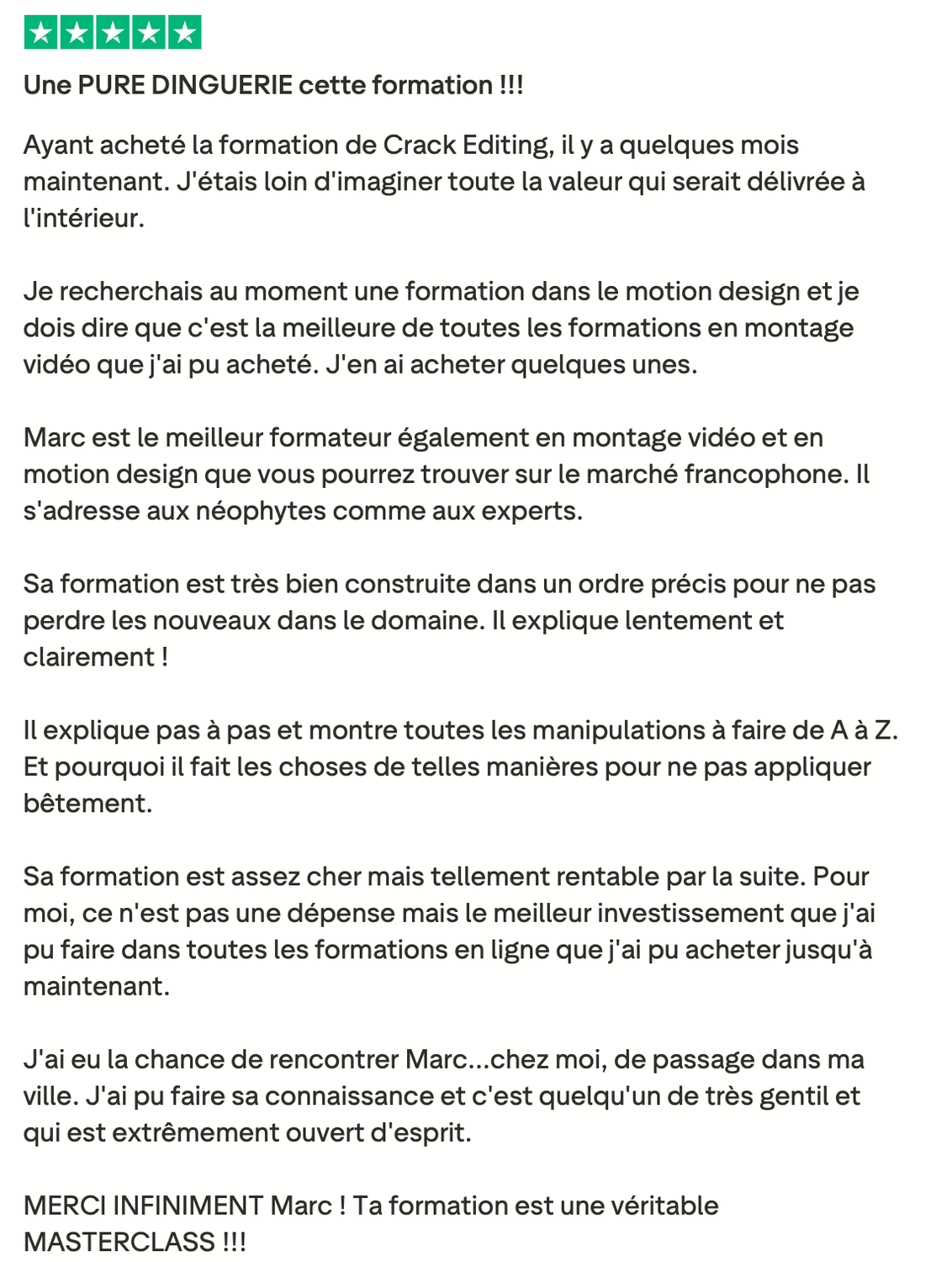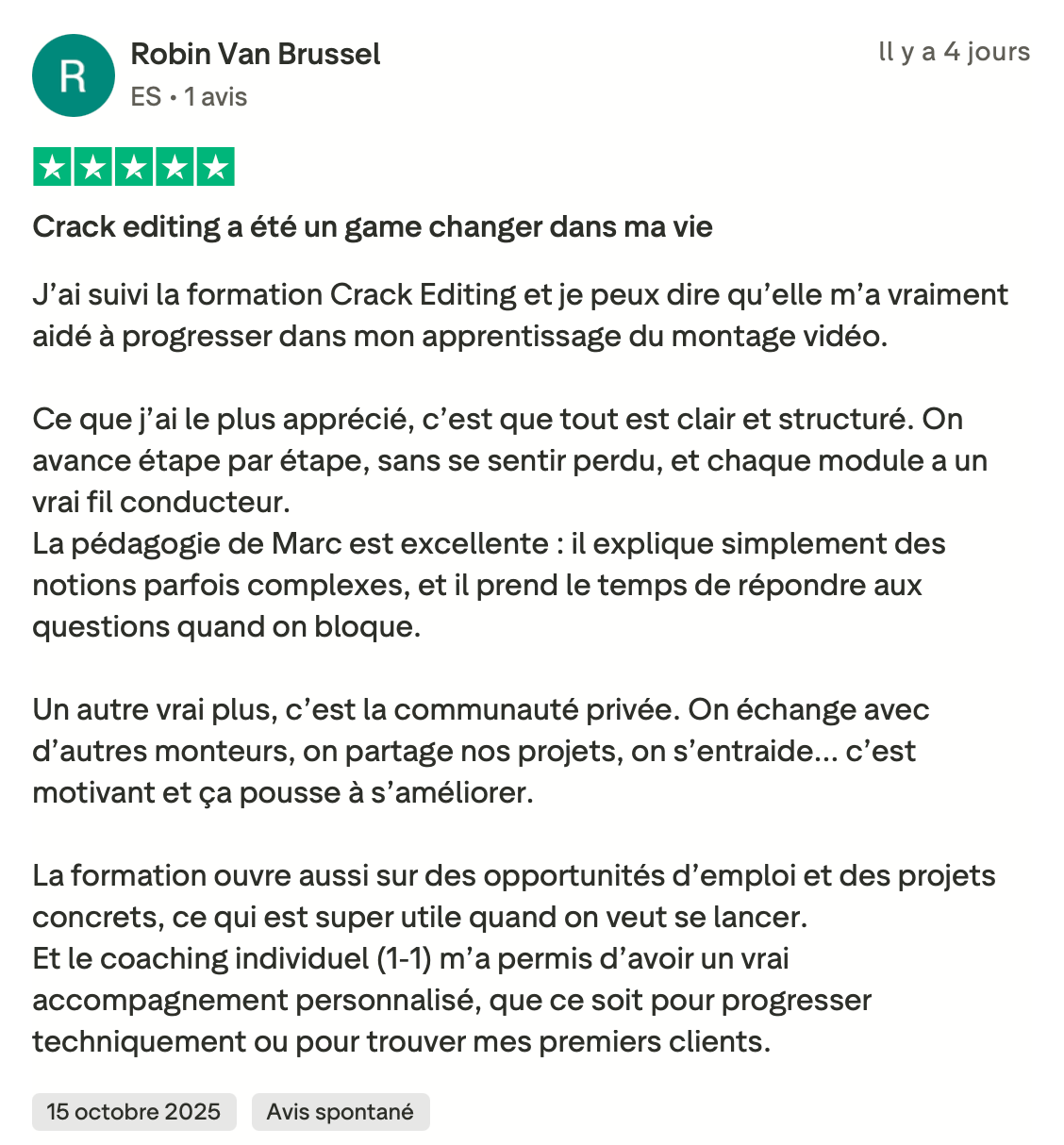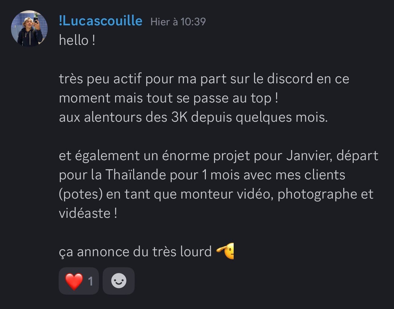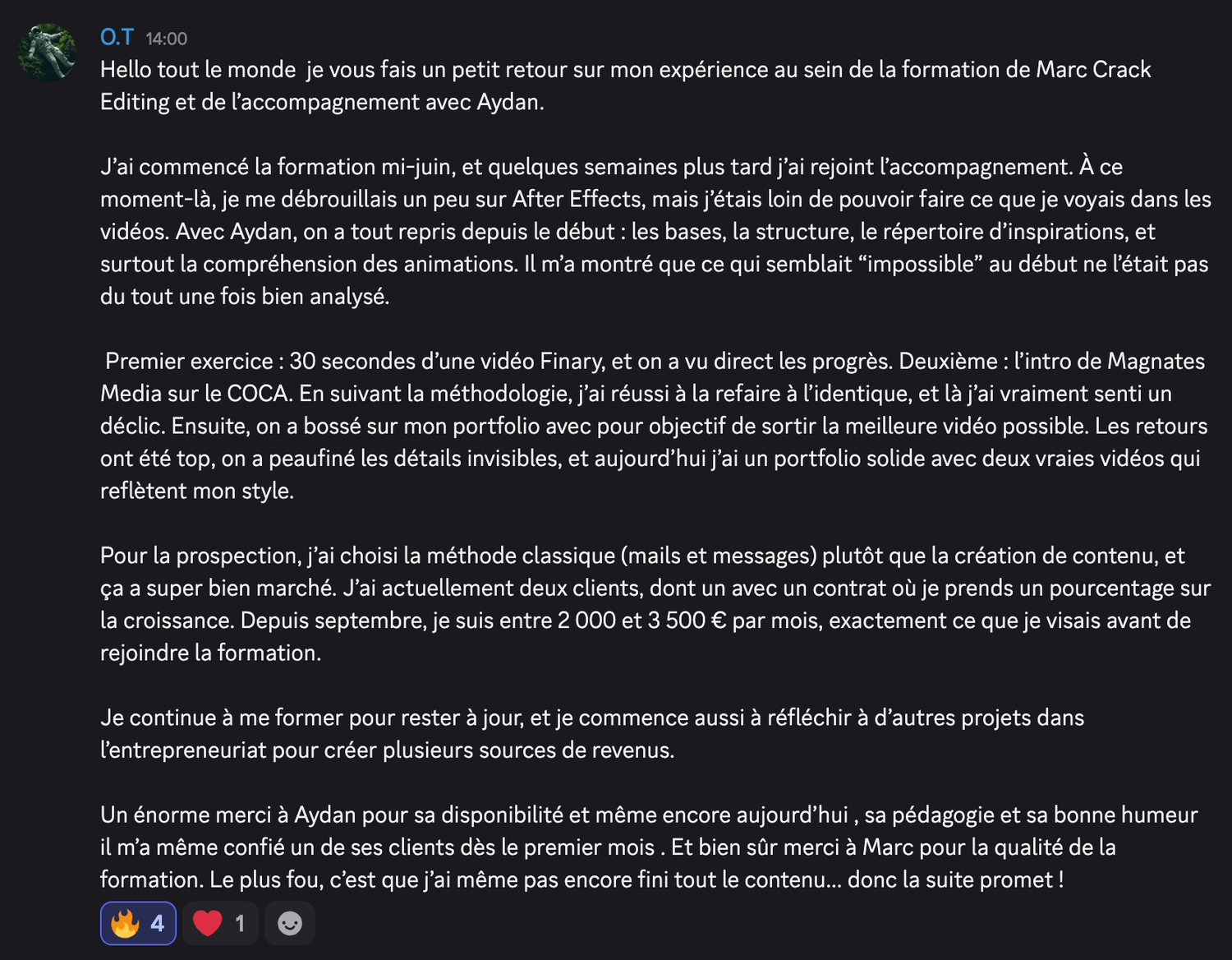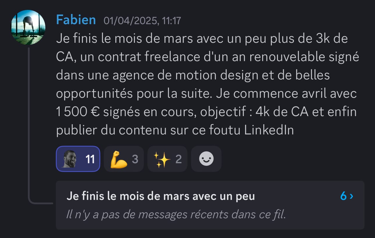 Si tu fais du montage vidéo et que tu as déjà eu quelques clients, mais que tu n'arrives pas à en vivre confortablement, cette vidéo est pour toi. Dans les prochaines minutes, je vais te montrer comment passer de monteur remplaçable, celui qu'on paye au lance-pierre et qu'on peut virer du jour au lendemain à un bras droit créatif qu'on valorise, qu'on garde, qu'on paye minimum trois mille euros par mois. Et ça, même si tu n'as pas encore un de dingue, tu n'as pas le temps pour te former, tu détestes prospecter et négocier. Mais d'abord, qui suis-je pour t'apprendre tout ça Je m'appelle Marc, j'ai vingt et un ans et en avril deux mille vingt trois, j'ai eu mon premier client en montage vidéo à cinq cents euros. Deux mois plus tard, je bossais avec Dali Dutiol, un gros créateur de contenu français et je facturais deux mille deux cents euros le mois. En moins d'un an, j'ai travaillé avec des gros de contenus comme Deli Dutiol, Grégoire Dossier et d'autres. J'ai réussi des tests de montage vidéo pour devenir monteur chez Iman Gadji. J'ai été invité à Cannes pour filmer une vidéo chez Yomi Dancel et j'ai même organisé un tournage qui n'a jamais été fait en France avec des grosses têtes que tu vois à l'écran. Tout ça parce que j'ai compris très tôt ce qui différencie un monteur qu'on remplace d'un monteur qu'on garde. Aujourd'hui, je me consacre à transmettre ce que j'ai appris. Ma mission, t'aider à devenir un crack du montage et atteindre minimum trois mille euros par mois. Mais avant d'aller trop loin, laisse-moi te montrer à quoi ressemble la vie d'un bras droit créatif. Imagine un instant, ton niveau technique est au-dessus de quatre vingt quinze pour cent des monteurs du marché. Tu maîtrises des techniques que très peu connaissent en France. Tu as développé ta propre vision créative, un style, une pâte, quelque chose qui te rend unique. Et surtout, tu n'es pas juste un menteur, tu es un pilier dans le business de tes clients. Tu comprends leur business, leur vision, tu proposes des idées, tu les surprends, tu es un bras droit créatif. Résultat, tu n'as plus besoin de prospecter. Les créateurs et les entrepreneurs viennent à toi. Des mecs avec des centaines de milliers d'abonnés et des boîtes qui ont besoin de quelqu'un comme toi. Ils arrivent dans tes DM, ils veulent bosser avec toi et ils sont prêts à mettre le prix. Tu dépasses les trois mille euros par mois. Tu peux enfin bouger de chez tes parents si tu y es encore, changer de ville ou même de pays, être cent pour cent indépendant financièrement, te faire plaisir sans regarder les prix, offrir des cadeaux à ta famille et investir chaque mois. Tu fais ce que tu aimes, tu es respecté et tu es payé à ta juste valeur. Sauf que là, maintenant, tu es loin de cette vie. Tu as déjà eu des clients, tu sais que c'est possible de gagner de l'argent avec le montage, mais tu n'en vis pas vraiment. Tu gagnes peut-être entre deux cents et huit cents euros par mois. Pas de quoi être indépendant. Tu es peut-être étudiant, salarié ou en reconversion. Tu dépends encore de quelque chose. Tes parents, les aides de l'État, ton job alimentaire, un patron qui te fait chier. Et le pire dans tout ça, tu sais que tu peux faire beaucoup mieux. Tu vois des monteurs sur Instagram qui affichent des projets avec des gros créateurs et toi tu te dis pourquoi pas moi Mais quand tu regardes ta situation, tu bosses avec des petits clients qui ne valorisent pas ton travail, tu te fais payer au lance-pierre, tu es remplaçable à tout moment et tu n'as aucune stabilité. Tu es ce qu'on appelle un monteur remplaçable. Et tant que tu restes dans cette position, rien ne changera. Donc finalement, pourquoi la plupart des monteurs restent bloqués à ce niveau Parce qu'ils font les mêmes erreurs encore et encore. En accompagnant des dizaines de monteurs, j'ai identifié les trois erreurs les plus courantes. Erreur numéro un, vouloir bosser avec des infopreneurs riches. T'as peut-être déjà entendu ce conseil, trouve des clients qui gagnent bien et ils te paieront bien. C'est une erreur. Les infopreneurs make money calculent tout. Ils ont des vidéos qui se ressemblent toutes, ils n'ont pas besoin de créativité. Pour eux, tu es une commodité qui est remplaçable à tout moment par une personne qui peut faire la même chose que toi pour moins cher. Et je peux te le dire, ce n'est pas avec ces clients là que tu deviendras un bras droit créatif. Erreur numéro deux, croire qu'il faut devenir un expert en négociation. Autre conseil qu'on entend souvent, si tu veux être bien payé, apprend à négocier. Faux. Si tu dois absolument négocier pour avoir un bon tarif, c'est que tu t'adresses aux mauvais clients. Les bons clients, ceux qui cherchent un bras droit créatif ne négocient pas. Soit tu les intéresse, soit non. Et s'ils te veulent, ils s'alignent sur tes tarifs. J'ai appris ça avec l'histoire d'Imman Gaddy. En deux mille vingt quatre, j'ai réussi les tests de montage chez Imman Gaddy et j'ai été sélectionné. Ensuite, j'ai passé un appel avec le lead éditeur. Pendant l'appel, il m'a demandé ses prétentions salariales et un pote m'avait dit il faut que tu demandes minimum 8 000 € Mark, parce qu'il ne faut pas que tu te fasses sous payer. Alors j'ai dit je veux 8 000 € par mois. Je n'ai jamais eu le poste et ce n'était pas un problème de négociation, c'était un problème de cohérence. Je postulais pour un poste de monteur novice dans l'équipe. Donc huit mille euros par mois, c'était délirant par rapport à ce que je proposais à ce moment-là. La leçon, c'est qu'au début, tu ne vas pas forcément gagner beaucoup, mais tu gagnes quelque chose de plus précieux l'apprentissage, l'expérience, un réseau. Et c'est tout ça qui va te permettre par la suite de facturer cher. Erreur numéro trois, délivrer plus que se former. Celle-là, je la vois tout le temps chez le